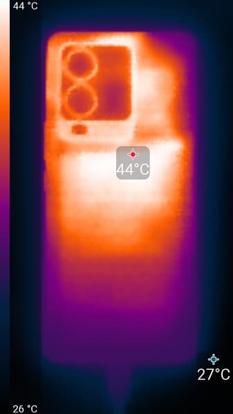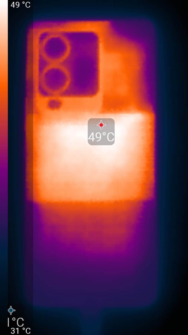 Нагрев больше в центральной части аппарата, что, видимо, соответствует расположению микросхемы SoC. По данным теплокамеры, максимальный нагрев составил 49 градусов (при температуре окружающего воздуха в 24 градуса), это типичный нагрев в случае данного теста в сравнении с другими современными производительными смартфонами. Для более-менее точного определения температуры на заднюю поверхность смартфона пришлось наклеить кусок тонкой клейкой ленты, что увеличило коэффициент излучения поверхности до значения, близкого к единице. Без клейкой ленты температура, определенная с помощью теплокамеры, была занижена.