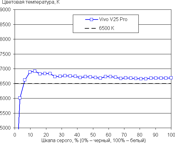 Даже в случае отсутствия коррекции баланс оттенков на шкале серого в случае профиля Профессиональный хороший, так как цветовая температура близка к стандартным 6500 К, а отклонение от спектра абсолютно черного тела (ΔE) ниже 10 единиц, что для потребительского устройства считается приемлемым показателем. При этом цветовая температура и ΔE мало изменяются от оттенка к оттенку — это положительно сказывается на визуальной оценке цветового баланса: