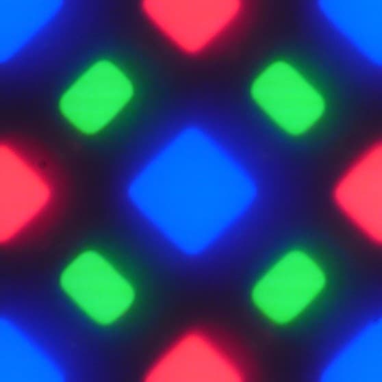 В этом экране используется матрица AMOLED — активная матрица на органических светодиодах. Полноцветное изображение создается с помощью субпикселей трех цветов — красного (R), зеленого (G) и синего (B), но красных и синих субпикселей в два раза меньше, что можно обозначить как RGBG. Это подтверждается фрагментом микрофотографии: