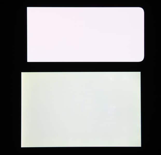 Экран характеризуется великолепными углами обзора. Правда, белый цвет при отклонении на большие углы приобретает очень легкий сине-зеленый оттенок, но черный цвет остается просто черным под любыми углами. Он настолько черный, что параметр контрастности в данном случае просто неприменим. Для сравнения приведем фотографии, на которых на экраны смартфона и второго участника выведены одинаковые изображения, при этом яркость экранов изначально установлена примерно на 200 кд/м², а цветовой баланс на фотоаппарате принудительно переключен на 6500 К.