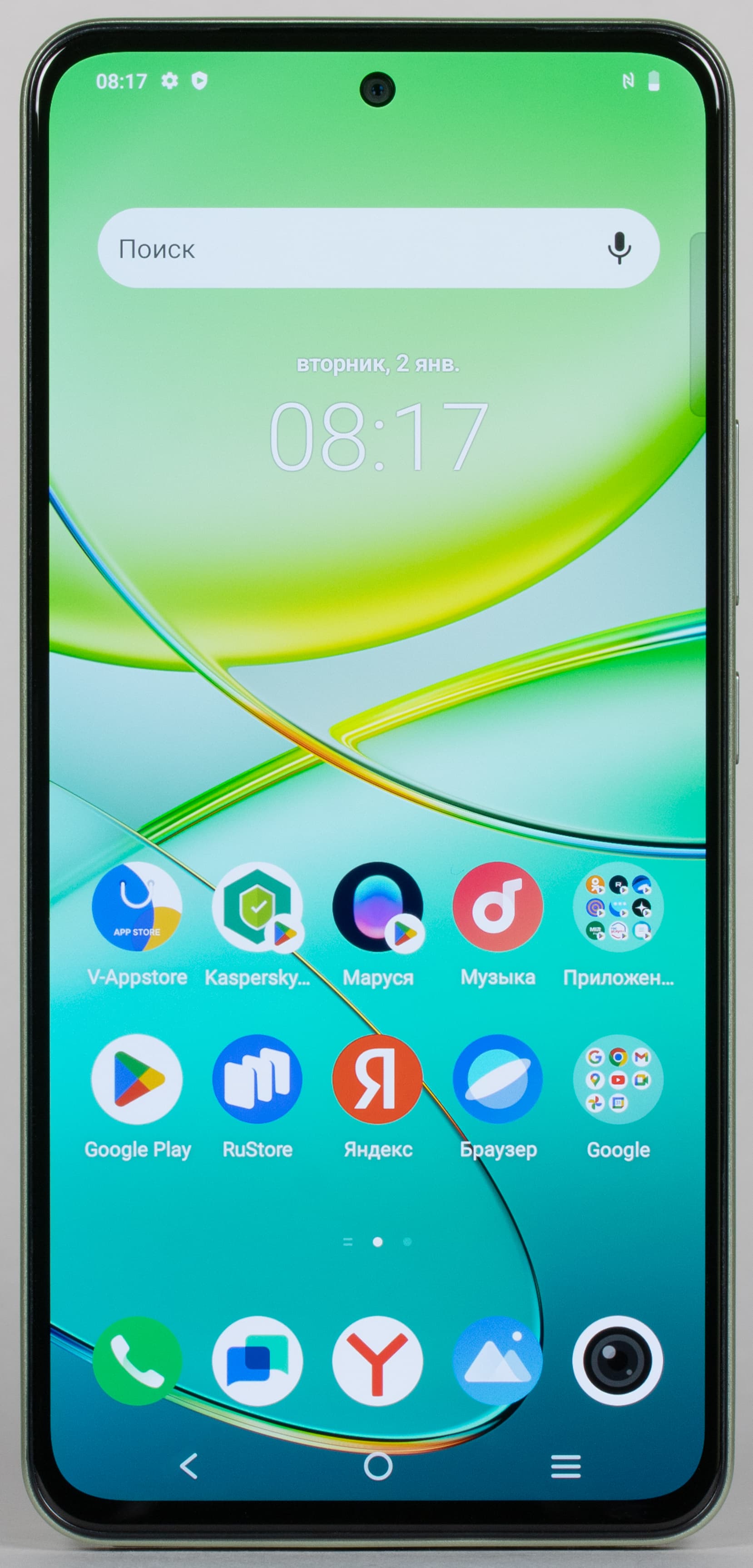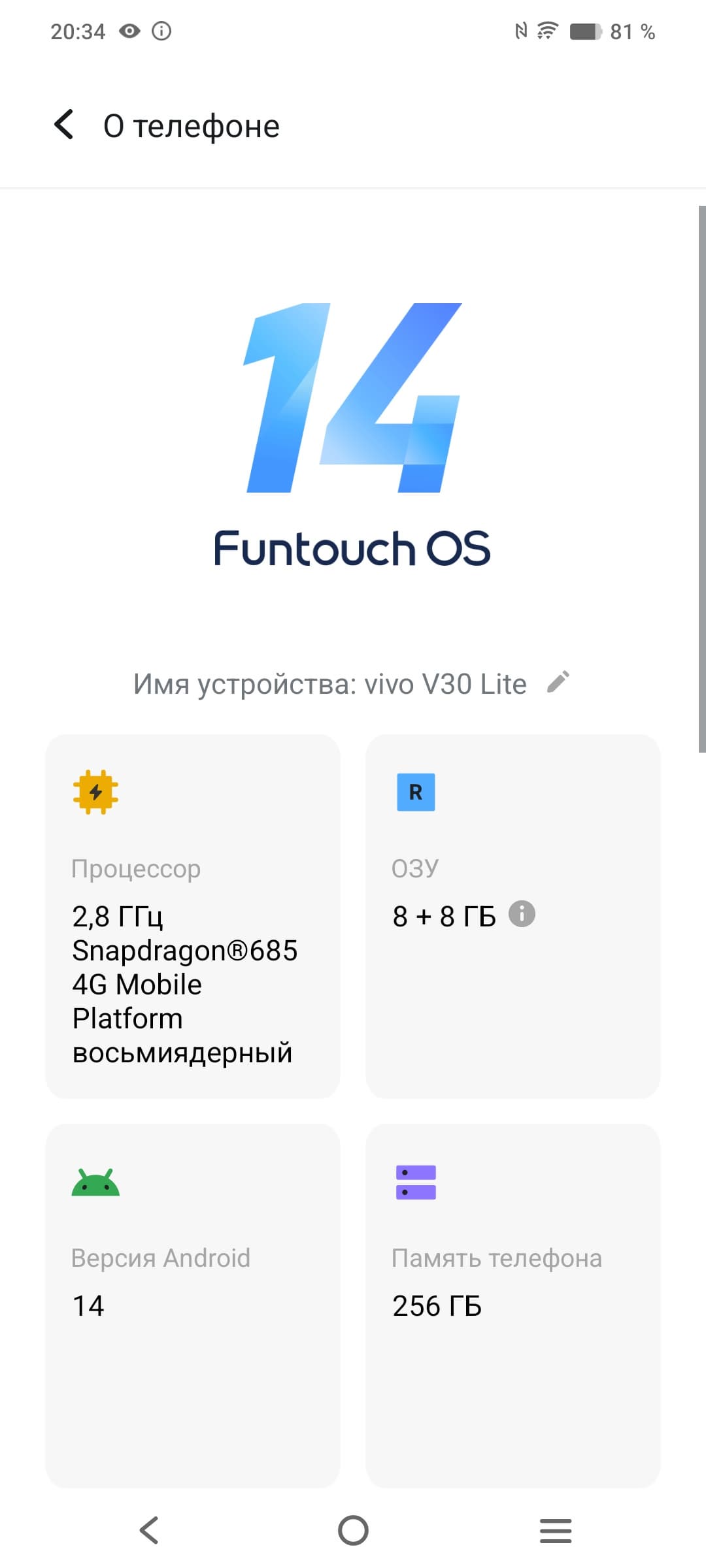 В качестве программной платформы смартфон использует ОС Android 14 с собственной оболочкой Funtouch 14. Интерфейс имеет давние корни, широкую поддержку, он хорошо оптимизирован и имеет массу разнообразных дополнительных функций. Рекламы нет, но он замусорен массой навязанных предустановленных приложений. Верхняя шторка не разделена на две части в зависимости от угла оттягивания. Официальный доступ к магазину и приложениям Google на месте, но имеется и собственный альтернативный магазин приложений.
