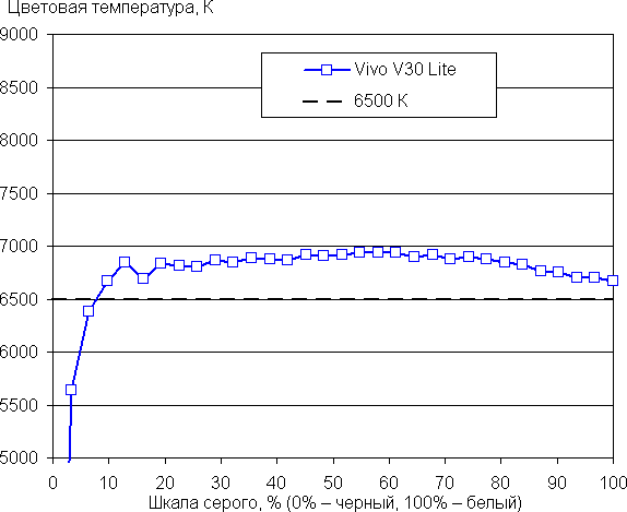 Даже в случае отсутствия дополнительной коррекции баланс оттенков на шкале серого в случае профиля Режим Pro хороший, так как цветовая температура достаточно близка к стандартным 6500 К, а отклонение от спектра абсолютно черного тела (ΔE) ниже 10 единиц, что для потребительского устройства считается приемлемым показателем. При этом цветовая температура и ΔE мало изменяются от оттенка к оттенку — это положительно сказывается на визуальной оценке цветового баланса: