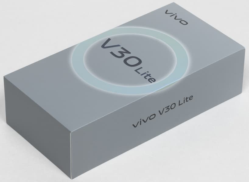 Смартфон Vivo V30 Lite поставляется в крупной картонной коробке, типично оформленной в фирменных цветах бренда.