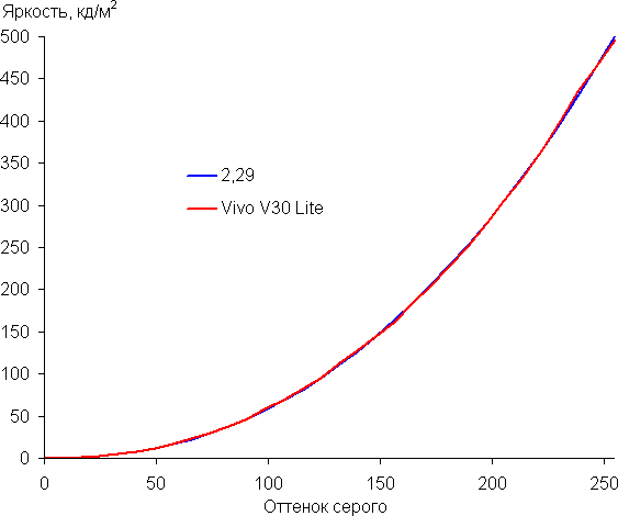 Построенная по 32 точкам с равным интервалом по численному значению оттенка серого гамма-кривая не выявила завала ни в тенях, ни в светах. Показатель аппроксимирующей степенной функции равен 2,29, что немного выше стандартного значения 2,2, при этом реальная гамма-кривая мало отклоняется от степенной зависимости: