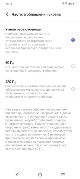 В настройках экрана можно включить режим с повышенной до 120 Гц частотой обновления:
