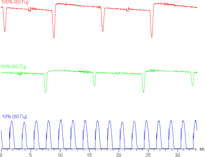 На высоком и среднем уровне яркости присутствует значимая модуляция с основной частотой примерно 60 или 120 Гц. На рисунке ниже приведены зависимости яркости (вертикальная ось) от времени (горизонтальная ось) для нескольких значений настройки яркости. Сначала для режима с частотой обновления 60 Гц: