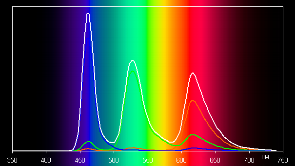 Без коррекции (вариант Яркий) спектры компонент (то есть спектры чистых красного, зеленого и синего цветов) очень хорошо разделены: