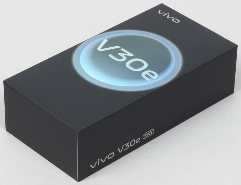 Смартфон Vivo V30e поставляется в твердой картонной упаковке со сдержанным лаконичным оформлением.