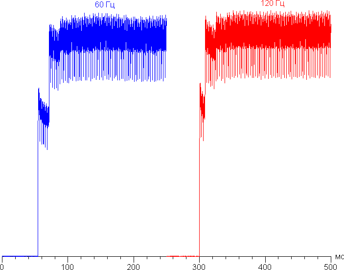 Переключение состояния элементов матрицы выполняется практически мгновенно, но на фронте включения может присутствовать ступенька шириной примерно 17 мс (при частоте обновления экрана 60 Гц) или примерно 8 мс (120 Гц). Например, так выглядит зависимость яркости от времени при переходе от черного к белому: