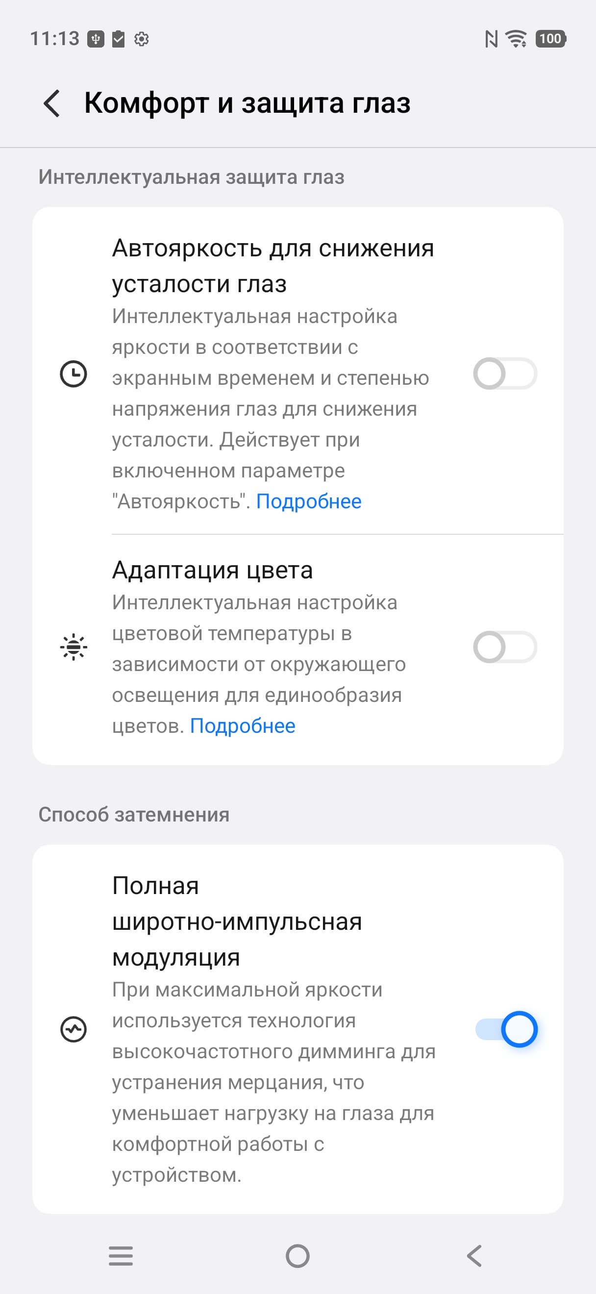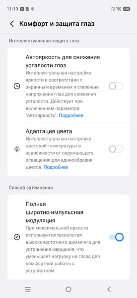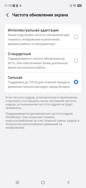 По факту режим всегда динамичный и, если не касаться экрана, то частота обновления почти сразу снижается до 30 Гц и даже до 1 Гц (по данным мониторинга). Данной настройкой пользователь ограничивает только максимальную частоту обновления. В режиме 120 Гц плавность прокрутки списков меню заметно повышается. Характер модуляции при этом не меняется.