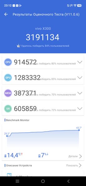 Смартфон работает на восьмиядерной SoC Mediatek Dimensity 9500, которая производится по нормам 3-нанометрового техпроцесса. Это топовая мобильная платформа очень высокого уровня, выдающая в AnTuTu 11 около 3,2 млн баллов. Такой производительности с избытком хватит для выполнения абсолютно любых задач, включая видеосъемку в режиме 4К@60 fps, а также для требовательных игр на высоких настройках графики. Правда, процессор очень сильно тротлится под высокой нагрузкой — очевидно, не в последнюю очередь из-за того, что трудно реализовать адекватное охлаждение внутри уменьшенного корпуса.
