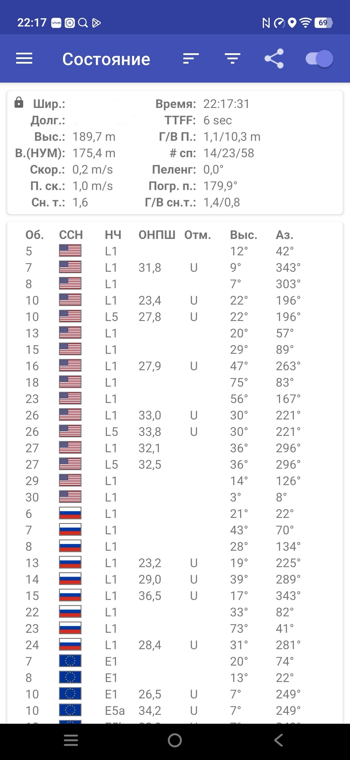 Двухканальный (согласно показаниям специализированного теста) модуль спутниковой навигации работает с GPS (L1+L5), а также Глонасс (G1), BDS (B1I+B1c+B2a), Galileo (E1+E5a) и QZSS (L1+L5). Первые спутники при холодном старте обнаруживаются быстро, точность позиционирования не вызывает претензий.