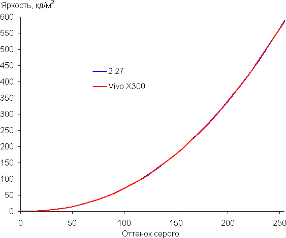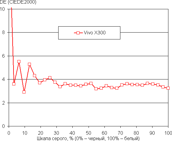 Напомним, что в случае OLED-экранов яркость фрагментов изображения динамично меняется в соответствии с характером выводимого изображения — слегка уменьшается для светлых в целом изображений. В итоге полученная зависимость яркости от оттенка (гамма-кривая), скорее всего, немного не соответствует гамма-кривой статичного изображения, так как измерения проводились при последовательном выводе оттенков серого почти на весь экран.
