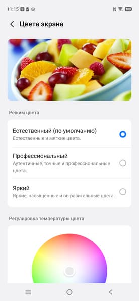Цветовой охват зависит от выбранного профиля (Естественный, Профессиональный или Яркий), от прописанного профиля в самом изображении, также от программы, которая выводит изображение на экран смартфона. В профиле Яркий охват всегда максимальный и цвета самые холодные. В профиле Естественный охват в обычных приложениях близок к sRGB, а в штатном приложении Альбомы соответствует прописанному в изображении, но в любом случае цвета немного холоднее, чем в случае профиля Профессиональный. В профиле Профессиональный охват в обычных приложениях близок к sRGB, а в приложении Альбомы соответствует прописанному в изображении, при этом цвета самые теплые. Если профиля в изображении нет, то считается, что оно соответствует sRGB. ПО, которое выводит изображение на экран, должно иметь информацию о возможностях экрана. К примеру Google Chrome поддерживает профили в изображении, но считает, что экран sRGB. Тогда как штатная программа Альбомы знает о возможностях экрана.