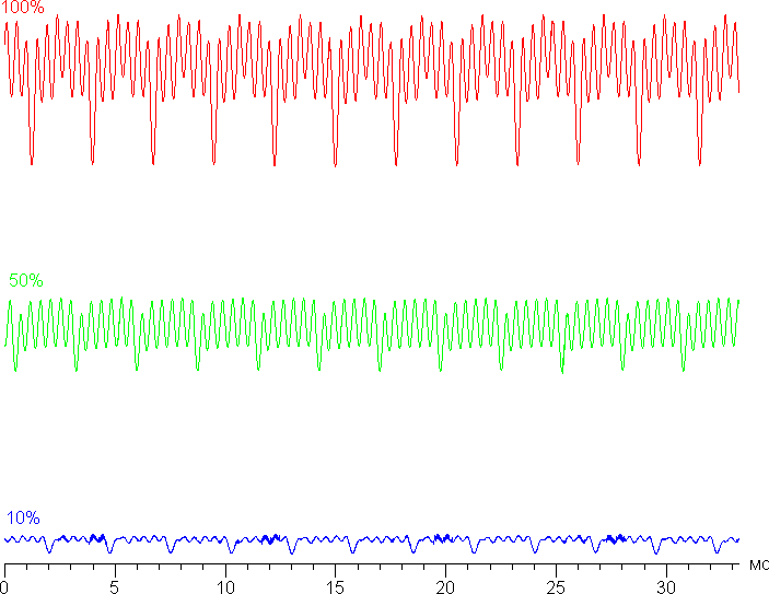 На любом уровне яркости присутствует значимая модуляция с частотой 360 Гц, к которой подмешивается дополнительной модуляция с высокой частотой (2160 Гц). На рисунке ниже приведены зависимости яркости (вертикальная ось) от времени (горизонтальная ось) для нескольких значений настройки яркости: