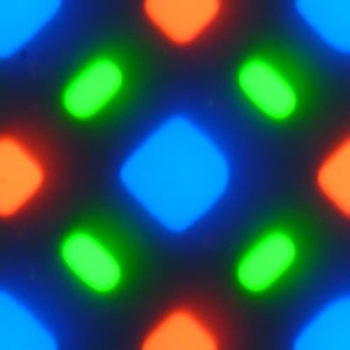 В этом экране используется матрица AMOLED — активная матрица на органических светодиодах. Полноцветное изображение создается с помощью субпикселей трех цветов — красного (R), зеленого (G) и синего (B), но красных и синих субпикселей в два раза меньше, что можно обозначить как RGBG. Это подтверждается фрагментом микрофотографии:
