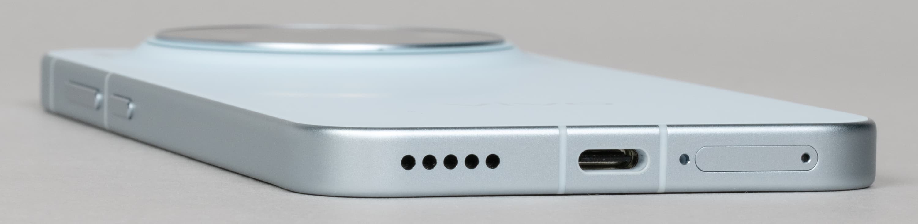 На нижнем торце установлены динамик, разъем USB Type-C (в кои-то веки это современный USB 3.2 Gen2) и микрофон. В выдвижной лоток можно установить две карты Nano-SIM, для карты памяти microSD разъема не предусмотрено.