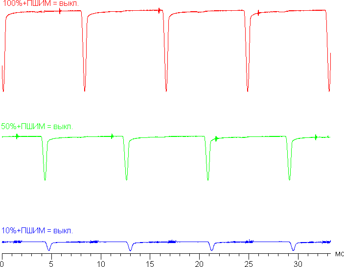 Видно, что скважность низкочастотной модуляции низкая, а частота второй составляющей высокая, в итоге видимого мерцания нет на любом уровне яркости. К тому же фаза модуляции различается по площади экрана, что также способствует отсутствию обнаруживаемого глазом мерцания.