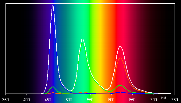 В первом случае спектры компонент (то есть спектры чистых красного, зеленого и синего цветов) очень хорошо разделены: