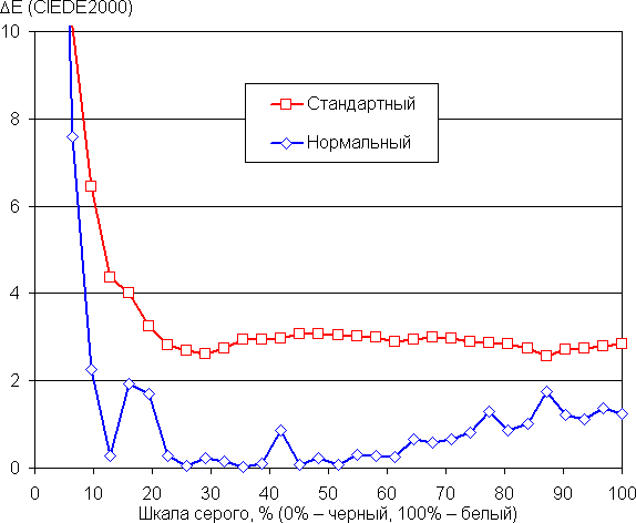 Даже в случае отсутствия коррекции баланс оттенков на шкале серого в случае профиля Нормальный режим приемлемый, так как цветовая температура не сильно выше стандартных 6500 К, а отклонение от спектра абсолютно черного тела (ΔE) ниже 2 единиц, что для потребительского устройства считается отличным показателем. При этом цветовая температура и ΔE мало изменяются от оттенка к оттенку — это положительно сказывается на визуальной оценке цветового баланса. В случае профиля Стандартный режим цветовая температура уже существенно выше 6500 К: