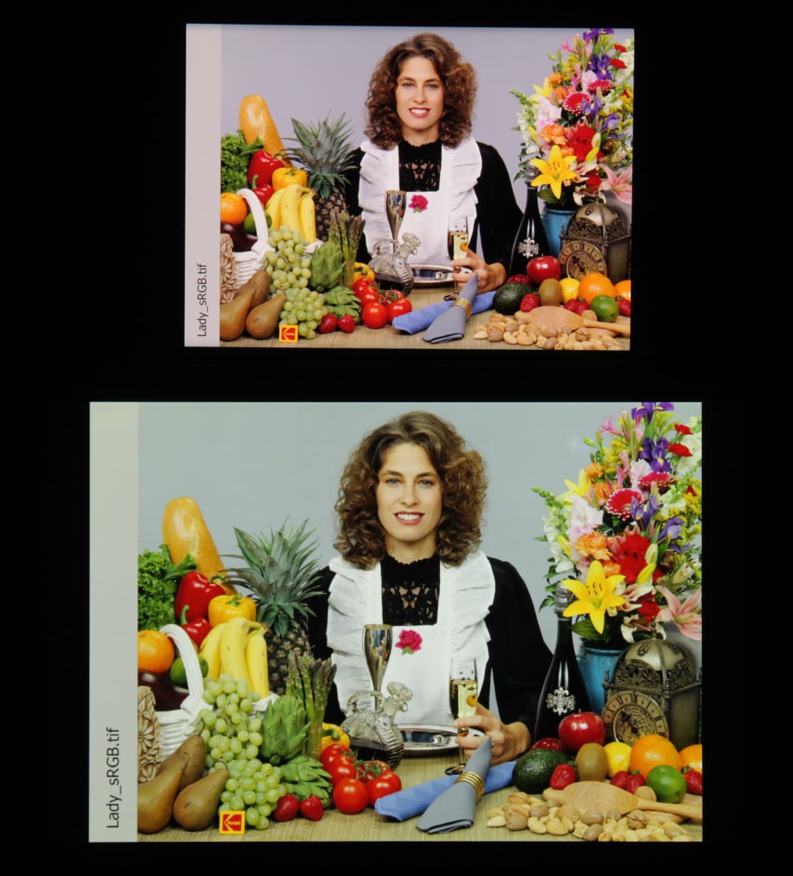 Даже в случае отсутствия коррекции баланс оттенков на шкале серого в случае профиля Профессиональный приемлемый, так как цветовая температура близка к стандартным 6500 К, а отклонение от спектра абсолютно черного тела (ΔE) ниже 10 единиц, что для потребительского устройства считается приемлемым показателем. При этом цветовая температура и ΔE мало изменяются от оттенка к оттенку — это положительно сказывается на визуальной оценке цветового баланса. В случае профиля Стандарт цветовая температура уже существенно выше 6500 К:
