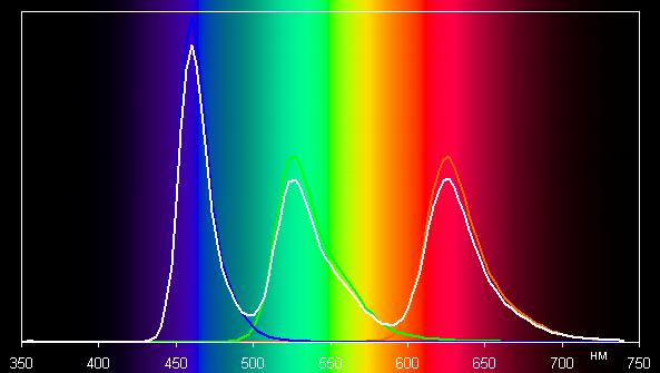 Без коррекции (вариант Яркий) спектры компонент (то есть спектры чистых красного, зеленого и синего цветов) очень хорошо разделены: