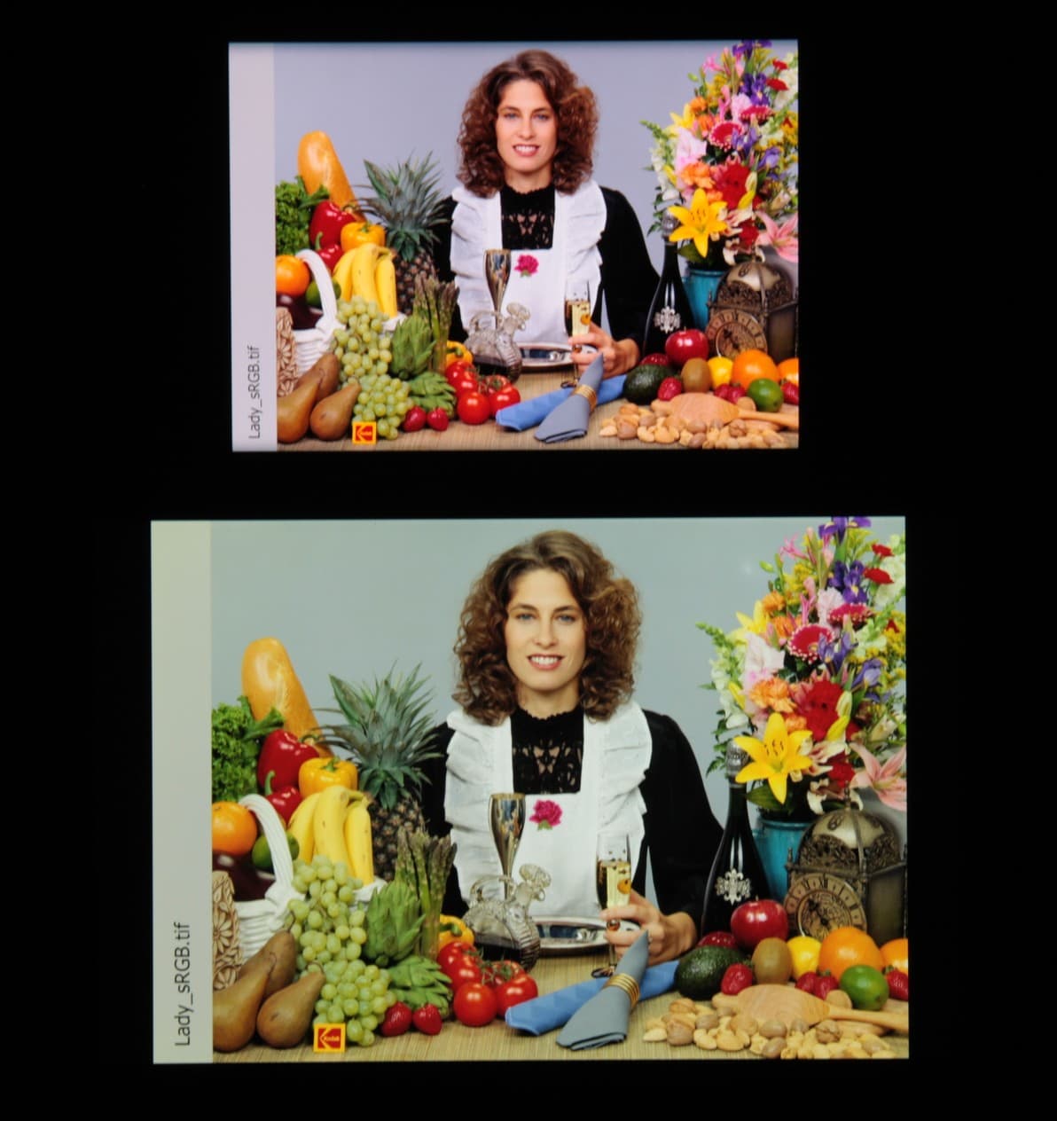 Этот профиль характеризуются хорошим приближением к охвату DCI (см. ниже). При выборе профиля Яркий насыщенность цветов еще выше: