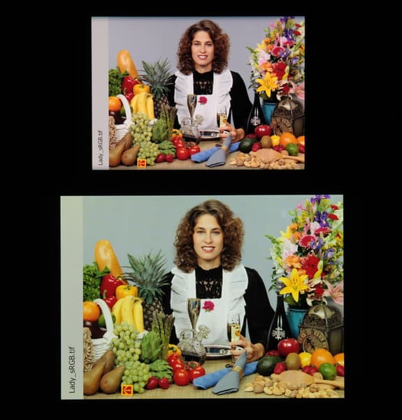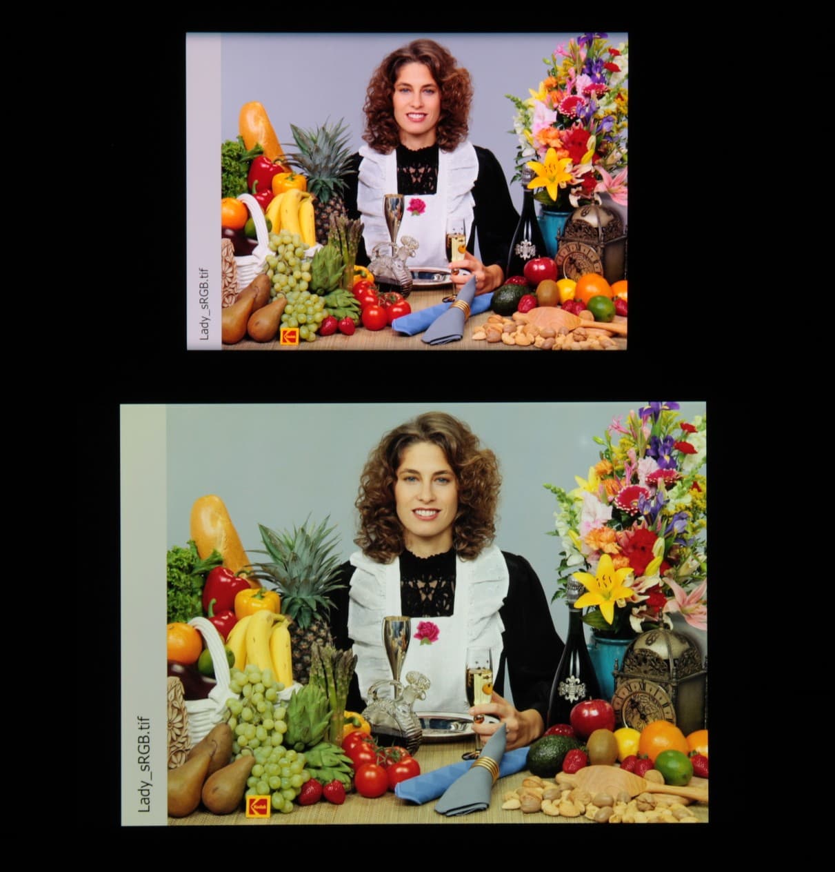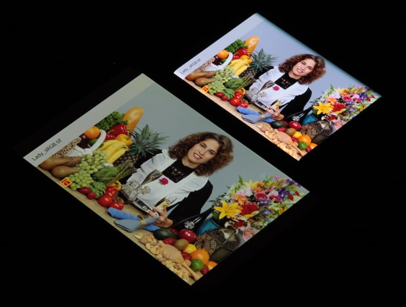 Согласно визуальной оценке, цвета у тестируемого экрана более-менее естественные, а цветовой баланс экранов немного различается. Напомним, что фотография не может служить надежным источником сведений о качестве цветопередачи и приводится только для условной наглядной иллюстрации. В частности, выраженный красноватый оттенок белого и серого полей, присутствующий на фотографиях тестируемого экрана, при перпендикулярном взгляде визуально отсутствует, что подтверждается аппаратными тестами с помощью спектрофотометра. Причина в том, что спектральная чувствительность матрицы фотоаппарата неточно совпадает с этой характеристикой человеческого зрения. Заметим, что в данном случае картинка занимает в высоту (при ландшафтной ориентации экрана) всю доступную для вывода изображения область и заходит на загнутые края экрана, что приводит к легкому затемнению и искажению цвета. Также на свету эти области почти всегда бликуют, что еще больше мешает при просмотре изображений, выведенных на весь экран. И даже картинка фильмов с соотношением сторон 16:9 заходит на загибы, что мешает при просмотре кино.