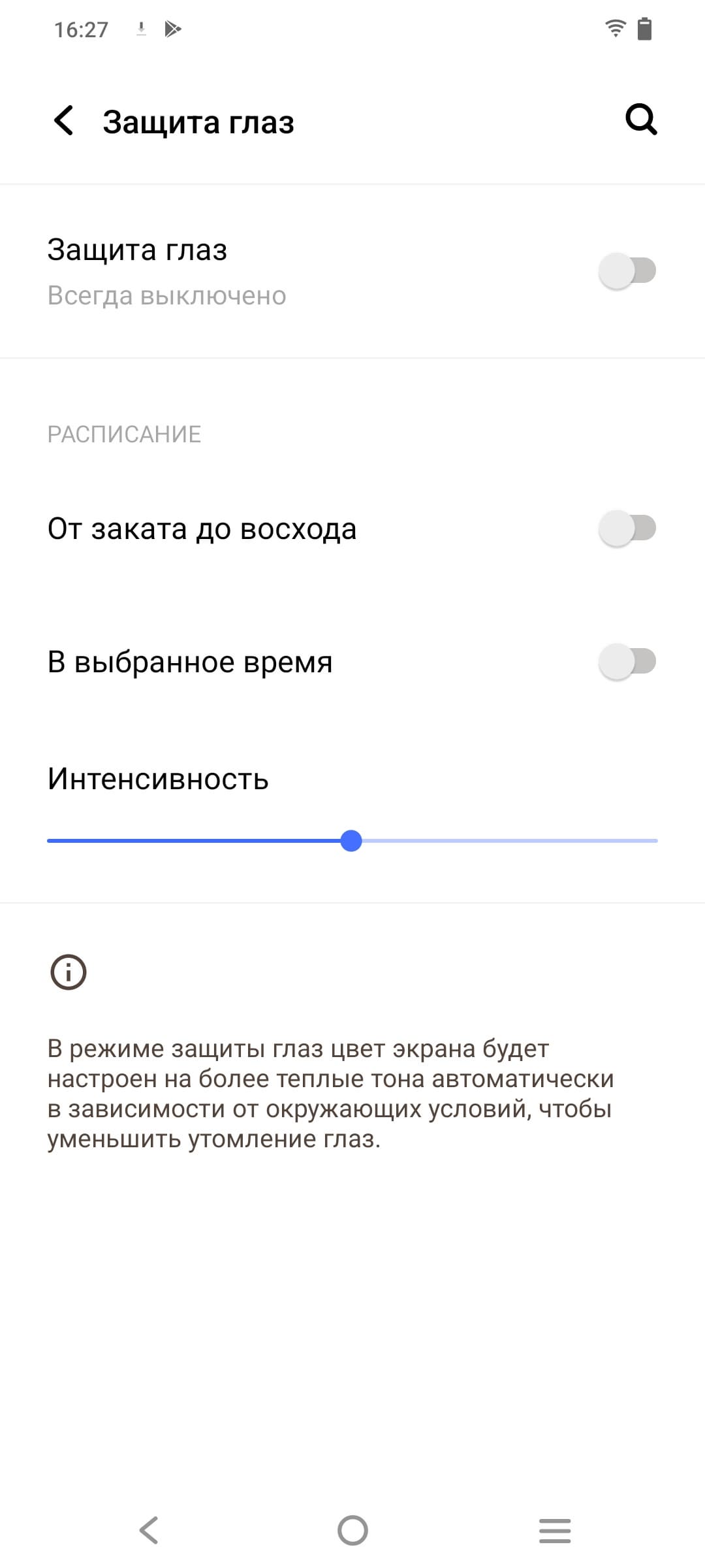 Разумеется, присутствует настройка (Защита глаз), позволяющая снизить интенсивность синей компоненты: