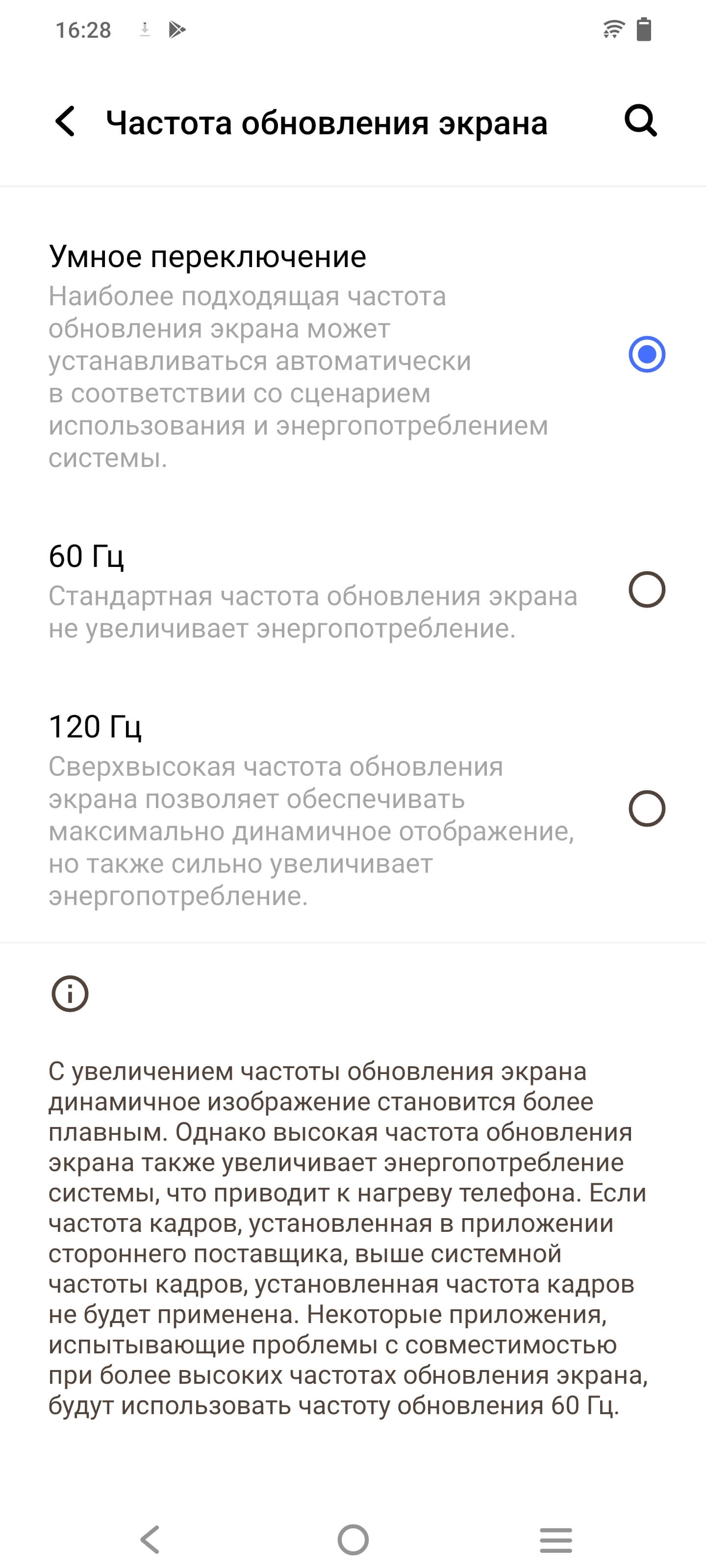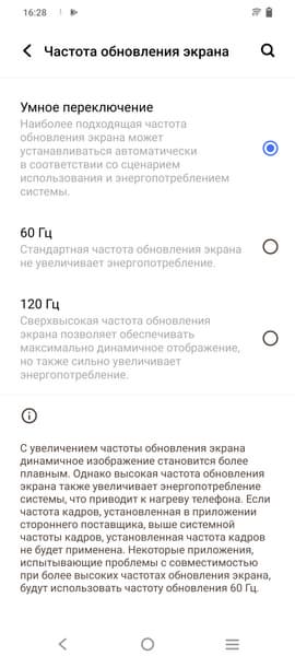 В настройках экрана можно включить режим с повышенной до 120 Гц частотой обновления: