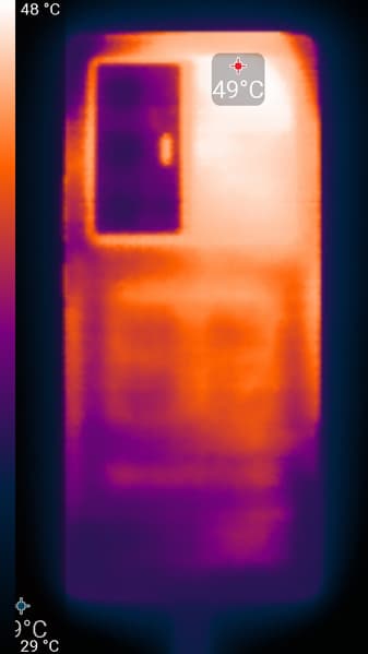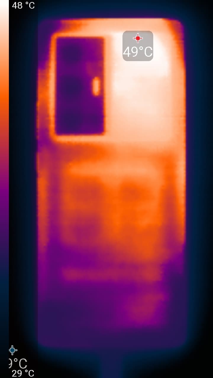 Нагрев больше в верхней части аппарата, что, видимо, соответствует расположению микросхемы SoC. По данным теплокамеры, максимальный нагрев составил 49 градусов (при температуре окружающего воздуха в 24 градуса), это очень сильный нагрев для данного теста в сравнении с другими современными смартфонами.