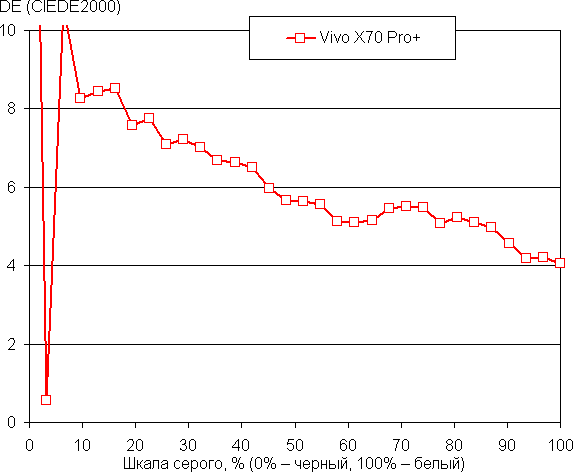 (Самые темные области шкалы серого в большинстве случаев можно не учитывать, так как там баланс цветов не имеет большого значения, да и погрешность измерений цветовых характеристик на низкой яркости большая.)