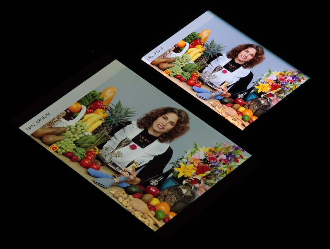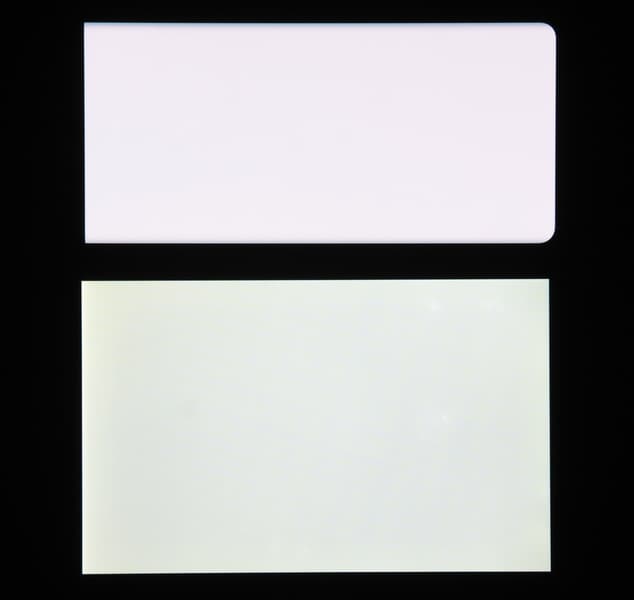 Экран характеризуется великолепными углами обзора. Правда, белый цвет при отклонении на большие углы приобретает легкий сине-зеленый оттенок, но черный цвет остается просто черным под любыми углами. Он настолько черный, что параметр контрастности в данном случае просто неприменим. Для сравнения приведем фотографии, на которых на экраны Vivo X70 Pro+ и второго участника выведены одинаковые изображения, при этом яркость экранов изначально установлена примерно на 200 кд/м², а цветовой баланс на фотоаппарате принудительно переключен на 6500 К.