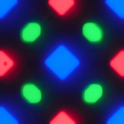 В этом экране используется матрица AMOLED — активная матрица на органических светодиодах. Полноцветное изображение создается с помощью субпикселей трех цветов — красного (R), зеленого (G) и синего (B), но красных и синих субпикселей в два раза меньше, что можно обозначить как RGBG. Это подтверждается фрагментом микрофотографии: