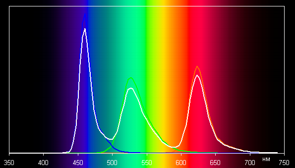 Без коррекции (вариант Яркий) спектры компонент (то есть спектры чистых красного, зеленого и синего цветов) очень хорошо разделены:
