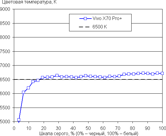Напомним, что в случае OLED-экранов яркость фрагментов изображения динамично меняется в соответствии с характером выводимого изображения — слегка уменьшается для светлых в целом изображений. В итоге полученная зависимость яркости от оттенка (гамма-кривая), скорее всего, немного не соответствует гамма-кривой статичного изображения, так как измерения проводились при последовательном выводе оттенков серого почти на весь экран.