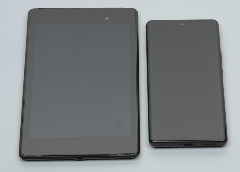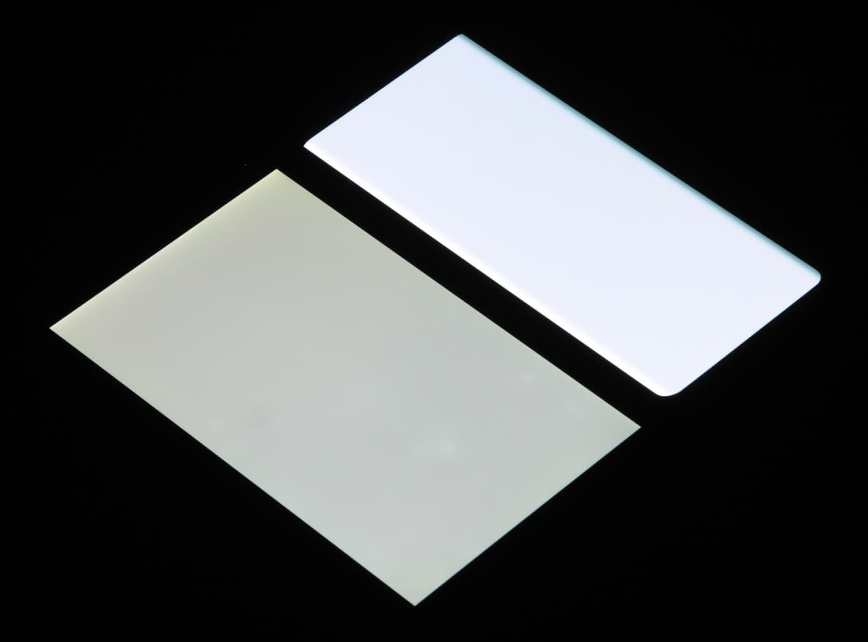 Лицевая поверхность экрана выполнена в виде стеклянной пластины с зеркально-гладкой поверхностью, устойчивой к появлению царапин. Судя по отражению объектов, антибликовые свойства экрана не хуже, чем у экрана Google Nexus 7 (2013) (ниже просто Nexus 7). Для наглядности приведем фотографию, на которой в выключенных экранах отражается белая поверхность (слева — Nexus 7, справа — Vivo X70 Pro+, далее их можно различать по размеру):