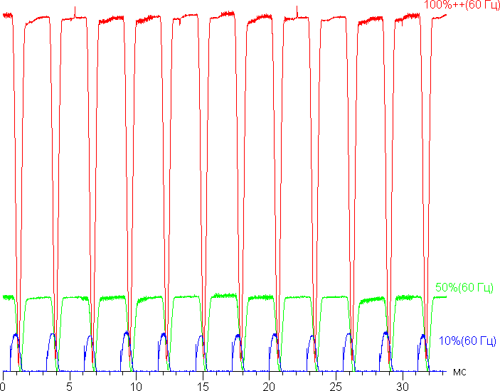 На любом уровне яркости присутствует значимая модуляция с частотой 360 Гц. На рисунке ниже приведены зависимости яркости (вертикальная ось) от времени (горизонтальная ось) для нескольких значений настройки яркости. Сначала для режима с частотой обновления «60 Гц»: