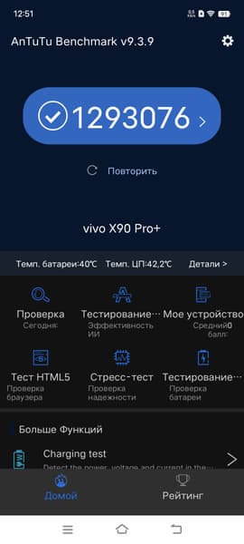 | AnTuTu (v9.x) (больше — лучше) | 1293076 | 1044654 | 1180538 | 1024226 | 815296 |