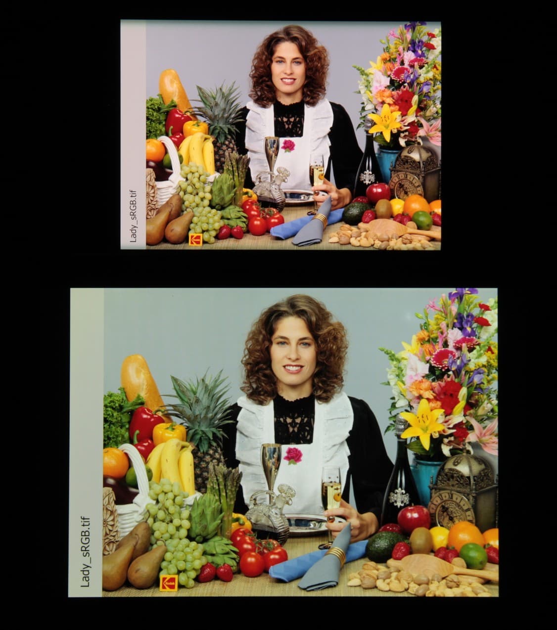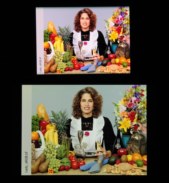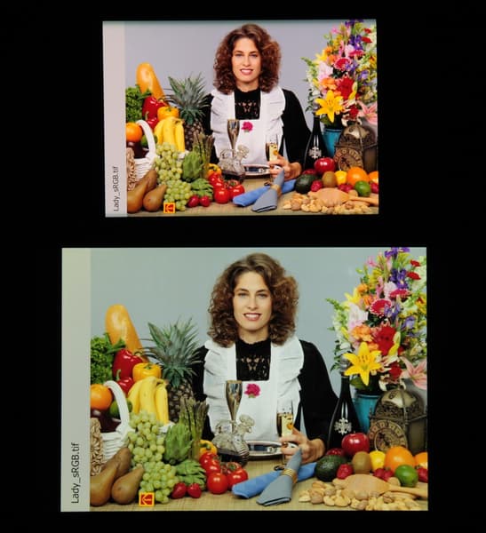 Отметим хорошую равномерность яркости и цветового тона белого поля (за исключением едва видимого затемнения и изменения оттенка к загнутым краям).