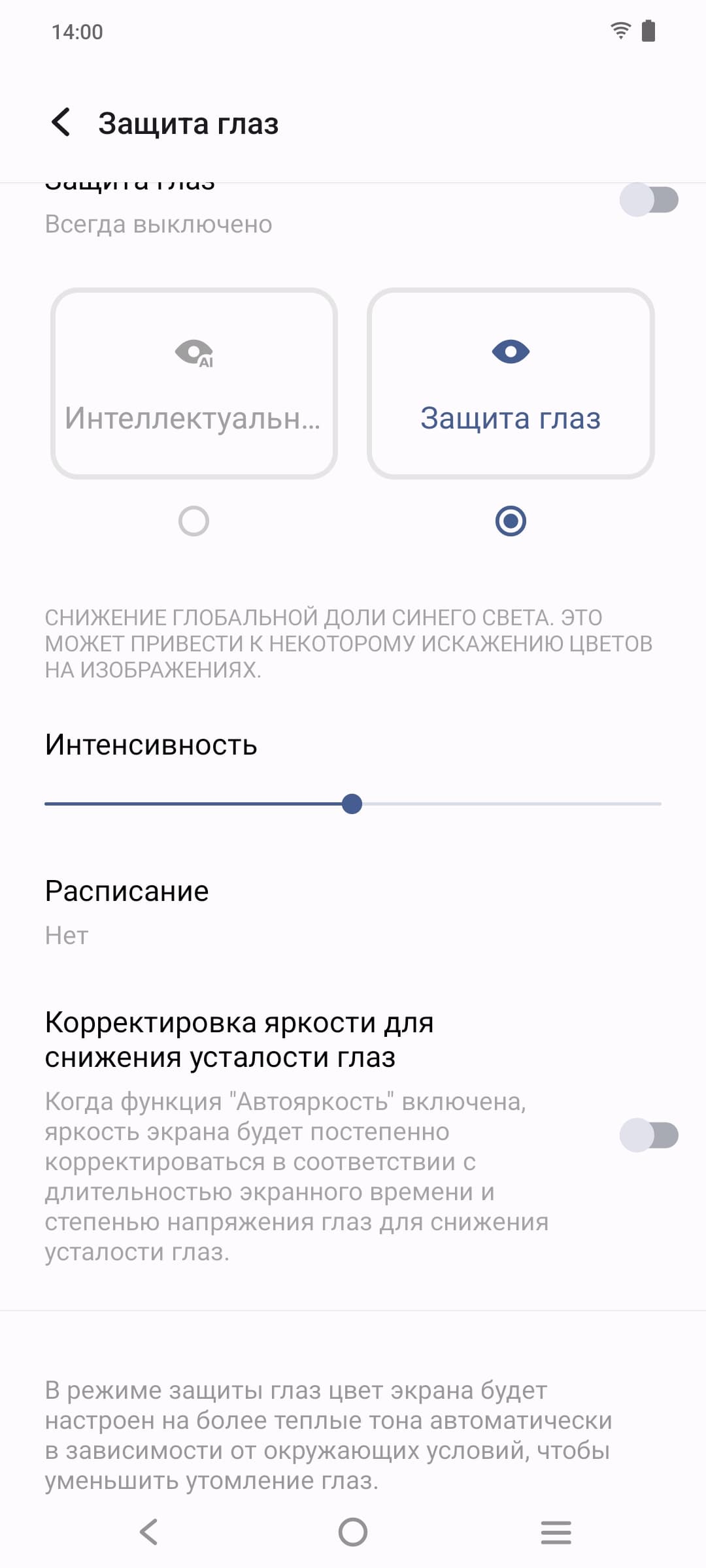 Разумеется, присутствует настройка (Защита глаз), позволяющая снизить интенсивность синей компоненты: