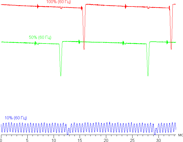 На высоком и среднем уровне яркости присутствует значимая модуляция с частотой примерно 60 или 120 Гц. На рисунке ниже приведены зависимости яркости (вертикальная ось) от времени (горизонтальная ось) для нескольких значений настройки яркости. Сначала для режима с частотой обновления 60 Гц: