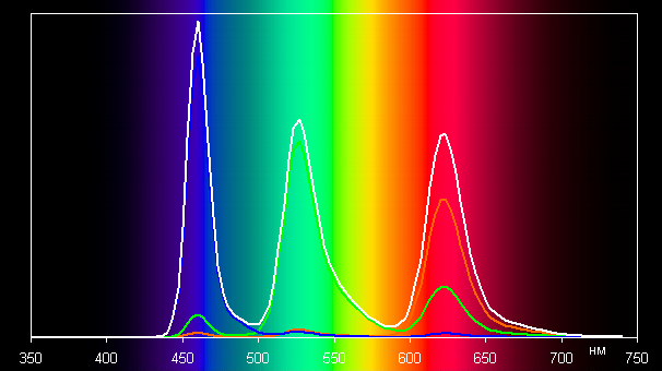 Без коррекции (вариант Яркий) спектры компонент (то есть спектры чистых красного, зеленого и синего цветов) очень хорошо разделены: