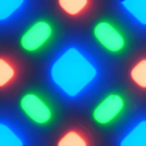 На фрагменте выше можно насчитать 4 зеленых субпикселя, 2 красных (4 половинки) и 2 синих (1 целый и 4 четвертушки), при этом, повторяя эти фрагменты, можно выложить весь экран без разрывов и перехлеста. Для таких матриц компания Samsung ввела наименование PenTile RGBG. Разрешение экрана производитель считает по зеленым субпикселям, по двум другим оно будет ниже. Присутствуют некоторая неровность контрастных границ и другие артефакты, но из-за высокого разрешения они лишь минимально сказываются на качестве изображения.