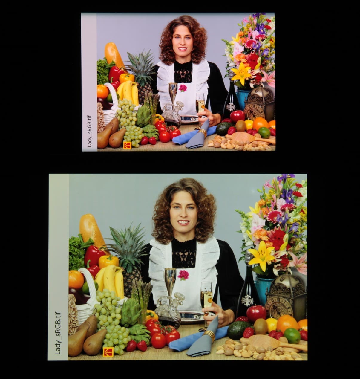 Согласно визуальной оценке, цвета у тестируемого экрана более-менее естественные, а цветовой баланс экранов немного различается. Напомним, что фотография не может служить надежным источником сведений о качестве цветопередачи и приводится только для условной наглядной иллюстрации. В частности, выраженный красноватый оттенок белого и серого полей, присутствующий на фотографиях тестируемого экрана, при перпендикулярном взгляде визуально отсутствует, что подтверждается аппаратными тестами с помощью спектрофотометра. Причина в том, что спектральная чувствительность матрицы фотоаппарата неточно совпадает с этой характеристикой человеческого зрения. Заметим, что в данном случае картинка занимает в высоту (при ландшафтной ориентации экрана) всю доступную для вывода изображения область и заходит на загнутые края экрана, что приводит к легкому затемнению и искажению цвета. Также на свету эти области почти всегда бликуют, что еще больше мешает при просмотре изображений, выведенных на весь экран. И даже картинка фильмов с соотношением сторон 16:9 заходит на загибы, что мешает при просмотре кино.