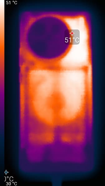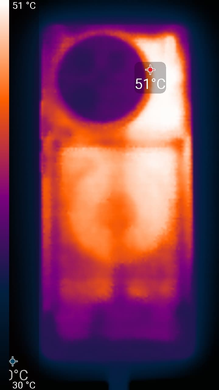 Нагрев больше в верхней части аппарата, что, видимо, соответствует расположению микросхемы SoC. По данным теплокамеры, максимальный нагрев составил 51 градус (при температуре окружающего воздуха в 24 градуса), это средний нагрев в случае данного теста в сравнении с другими современными смартфонами.