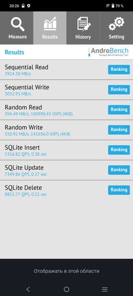 Результаты теста AndroBench на скорость работы с памятью: