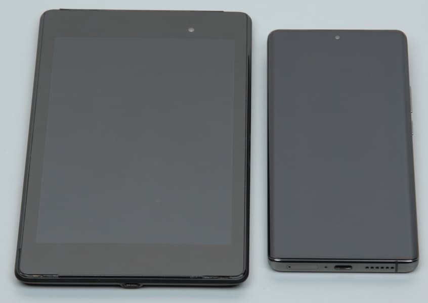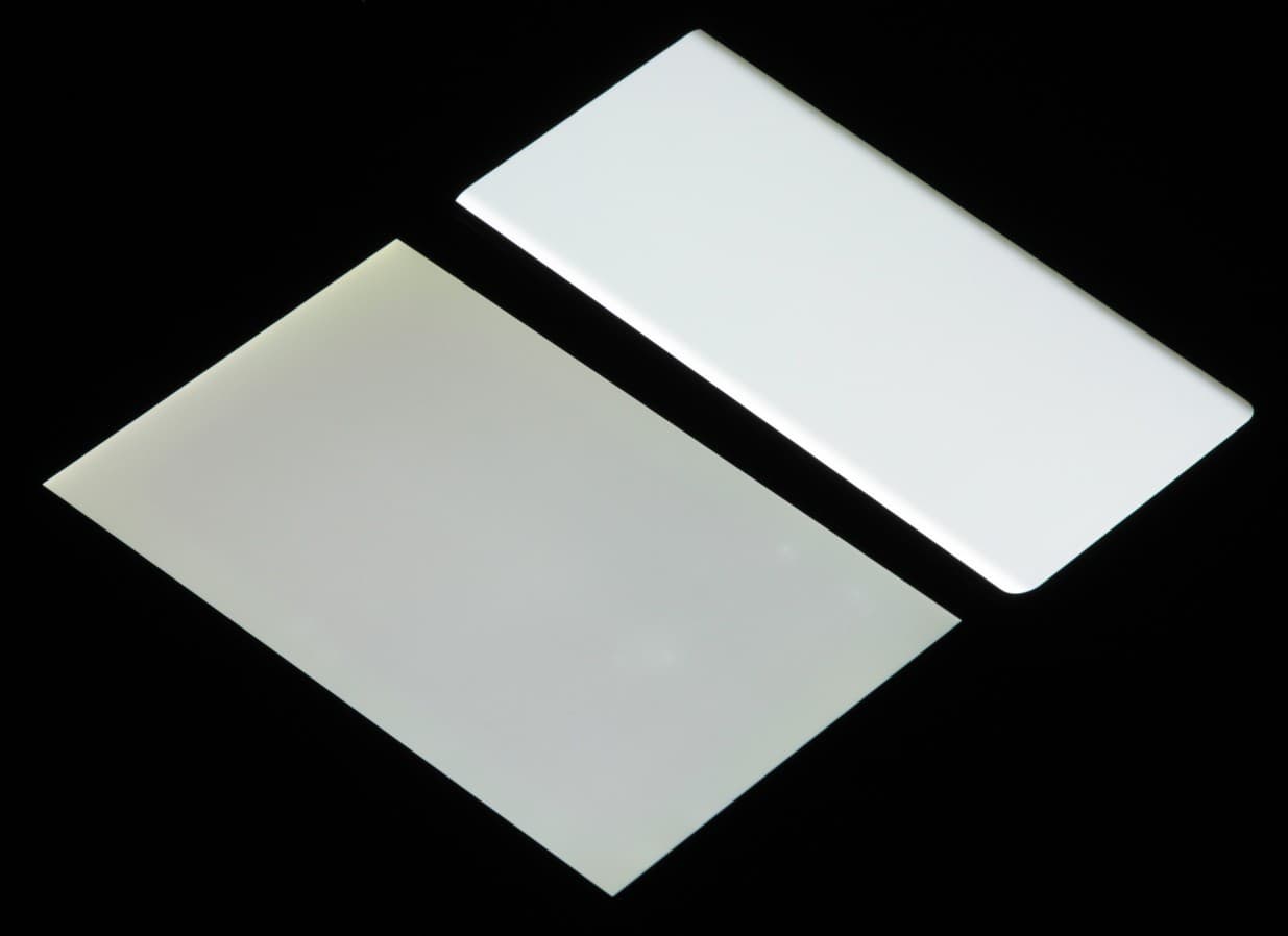 Лицевая поверхность экрана выполнена в виде стеклянной пластины с зеркально-гладкой поверхностью, устойчивой к появлению царапин. Судя по отражению объектов, антибликовые свойства экрана лучше, чем у экрана Google Nexus 7 (2013) (ниже просто Nexus 7). Для наглядности приведем фотографию, на которой в выключенных экранах отражается белая поверхность (слева — Nexus 7, справа — Vivo X90 Pro, далее их можно различать по размеру):
