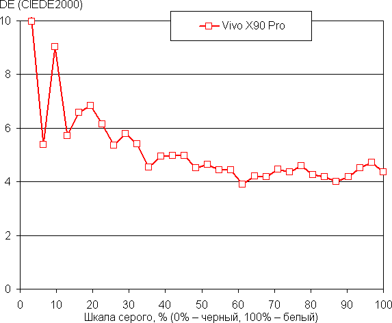 Напомним, что в случае OLED-экранов яркость фрагментов изображения динамично меняется в соответствии с характером выводимого изображения — слегка уменьшается для светлых в целом изображений. В итоге полученная зависимость яркости от оттенка (гамма-кривая), скорее всего, немного не соответствует гамма-кривой статичного изображения, так как измерения проводились при последовательном выводе оттенков серого почти на весь экран.