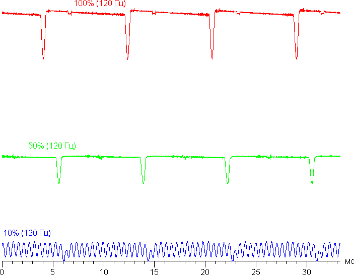 Частота модуляции на высокой и средней яркости увеличилась до 120 Гц, а на низкой характер модуляции такой же, что и в случае частоты обновления 60 Гц. Видимое мерцание отсутствует. Отметим, что частота повышается до 120 Гц только в случае динамичного изображения, на статичном всегда 60 Гц.
